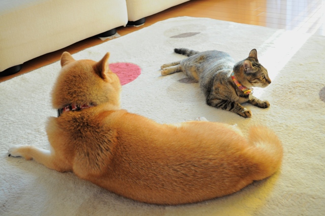 1人と2匹の金曜の夜。 仕事から帰って熱烈な「お帰りなさい」の儀式の後、 ほんのちょっとのつもりで目をつぶったら、なんと2時間半も寝てしまいました。 ずっとお腹の上にはつーちゃん、ほっぺにはかぼちゃんのお鼻ツンツンを感じていたけど、起きられなかった・・・