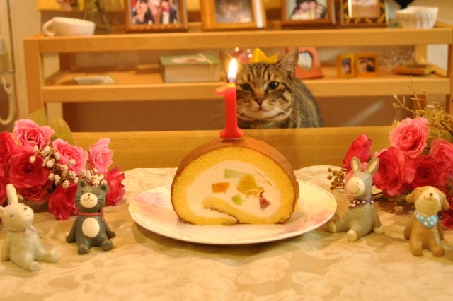 1日遅れの誕生会。 銀ちゃん、1歳おめでとう! 「これは人間用のケーキだから、写真を撮るだけね!」なんて言っていたら、 目にも止まらぬ速さでパンチが飛んできました。 つーちゃん!! 冠は吹っ飛び、銀ちゃんはフリーズ。