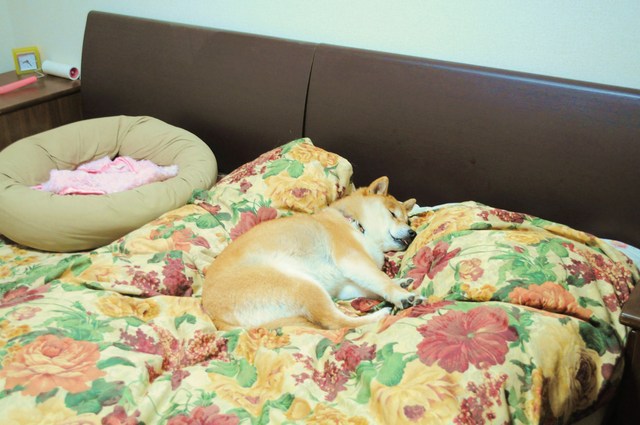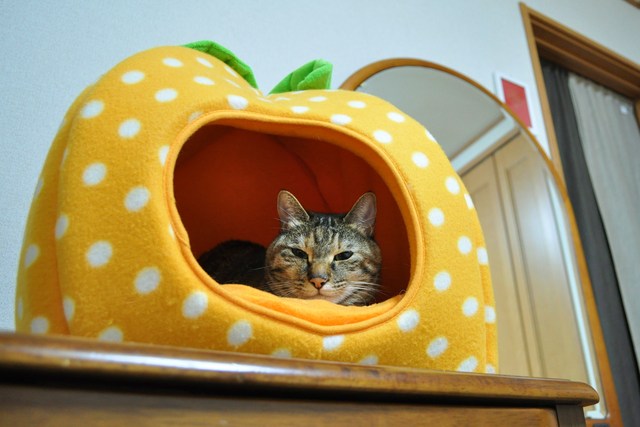 寝ようと思って女子部屋に行ったら、 かぼちゃんが私のベッドで寝ていました。 シャッターの音に気付いて目を覚ましたけど、 動く気はないみたい。 「かぼちゃん、どいて!」と言ったら、むっくり顔を上げて、 わざとらしく大あくびを