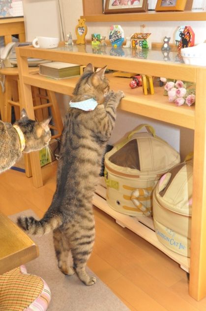 夕飯の支度をする私をじっと見つめるかぼちゃん。「おかあさん、もうすぐできる?」「今日のご飯はなにかニャ?」つーちゃんは私の正面で静かに待ちます。2匹のお姉さんはとってもお利口なのに飛んだり跳ねたり大騒ぎする子もいるんです。何回叱られても何回追っ払われてもめ