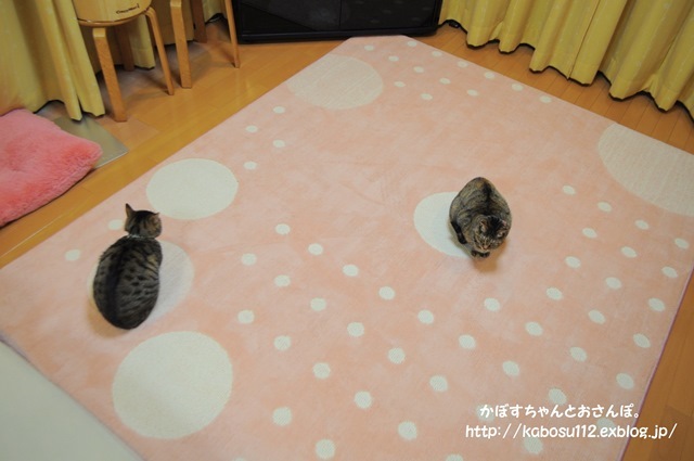 新しいカーペットが届きました。猫たちはすっかり気に入ったようです。「この模様が最高だニャ!」と言ってます。とっても落ち着くらしいです。猫って本当に丸が好きなのね(笑)************************「かぼすちゃんとおさんぽ。」は、ランキン