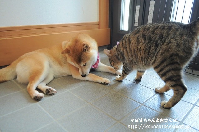かぼちゃんのお散歩の後は銀ちゃんの厳しいチェックが入ります。まずはあんよの匂いをスンスン。次に体の匂いをスンスン。そしたらゴロンと横になり、ねぇ、かぼちゃん、今日はどこに行ったの?何して遊んできたの?何か美味しいもの食べなかった?ねぇ、ねぇ、かぼちゃん!