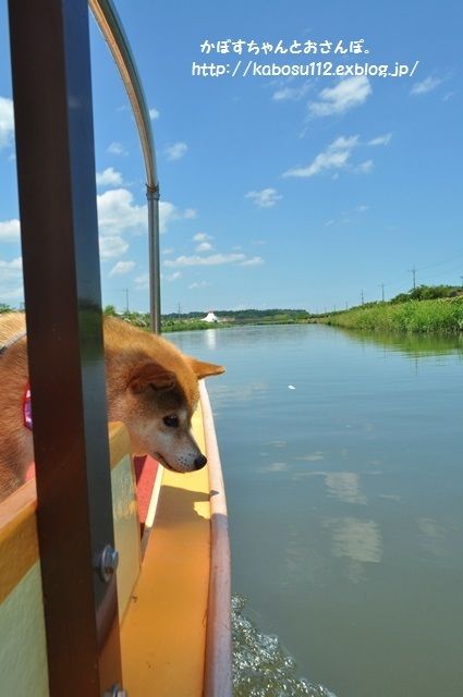 ゆらりゆらりと屋形船。フェリーも、カヌーも、カヤックも、体験済みのかぼちゃんですが屋形船は初めてです。船首にちょこんと座ってる姿はまるでワンコの船頭さん。一緒に乗船したお客さん達から「可愛い!可愛い!」と大人気でした。「ワンコばっかり見ちゃって風景見るの