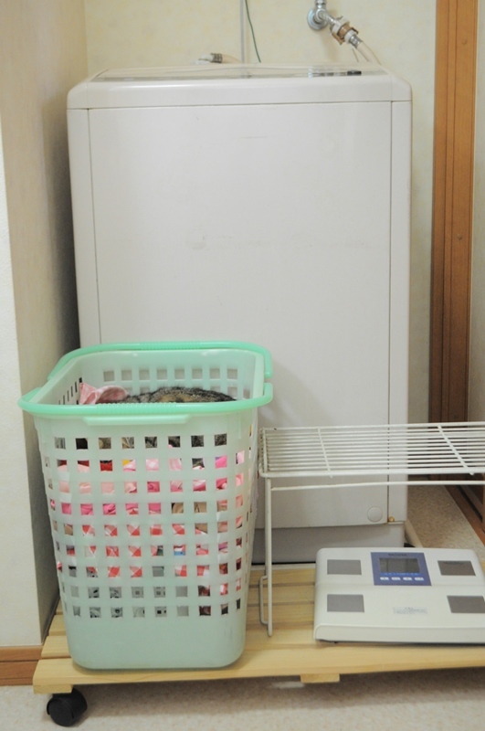 お風呂に入ろうと脱いだTシャツを洗濯かごに放り投げようとしておっとっと!銀ちゃんったら、こんな所で寝てました。慌ててリビングにカメラを取りに行ったらかぼ父さんが偉そうにこう言いました。銀は俺が風呂に入る前からそこで寝てたんだぞ!えっ、写真撮るの?俺のパン