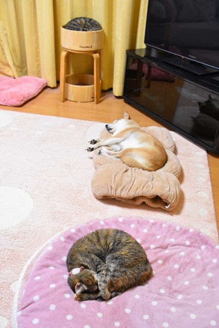 このベッドは○○専用という決まりがないのが我が家の決まり。今はこんなふうに寝ていてもちょっと時間が経つと寝ている場所が入れ替わっていたりするから面白い。「あれま、いつの間に?」って感じ。このベッドはかぼちゃんには無理だけどね。寝ながらフルーツバスケットみ