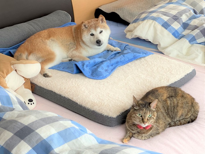 カーテンの向こうで誰かさんと誰かさんが仲良く寝ていますよ。こっちはオニちゃん。お隣はもちろん銀ちゃん?じゃなくてつーちゃんでした!えー(*_*)こんなの見たことないですよ。オニちゃんはつーちゃんのことが怖くなくなったのかな?つーちゃんはオニちゃんにイライラしな