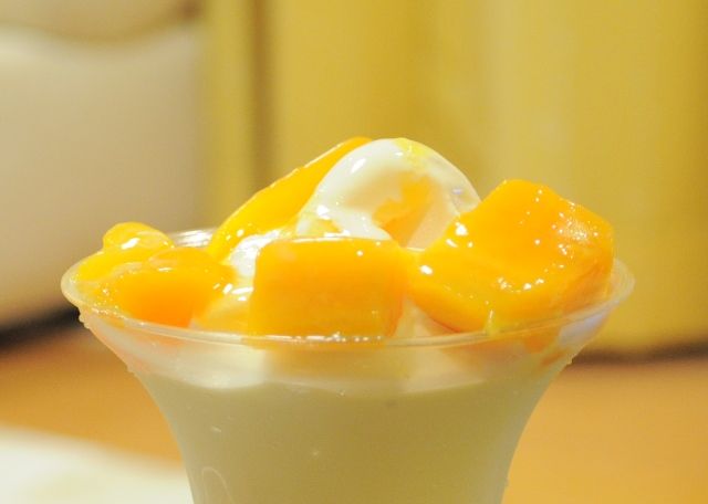 2号に買いに行かせた、ミニストップの「アップルマンゴーパフェ」を頂きました。
