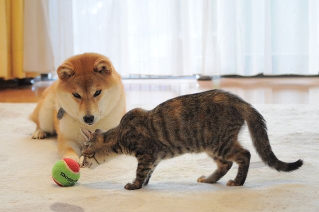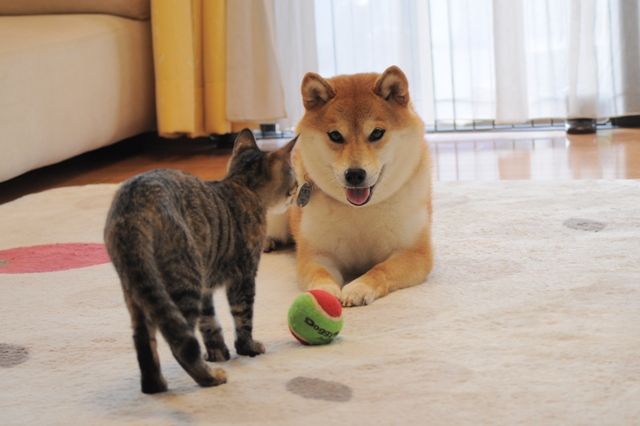 つーちゃんを見つめるかぼちゃんの優しい眼差し。 とても犬とは思えないな!