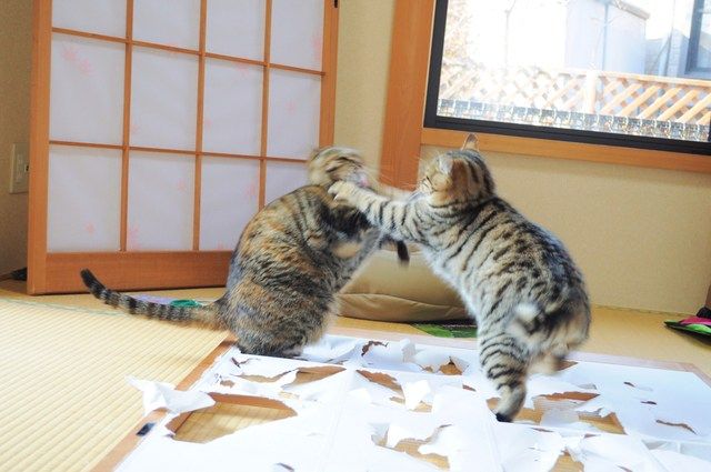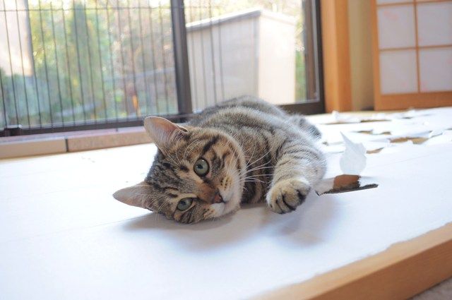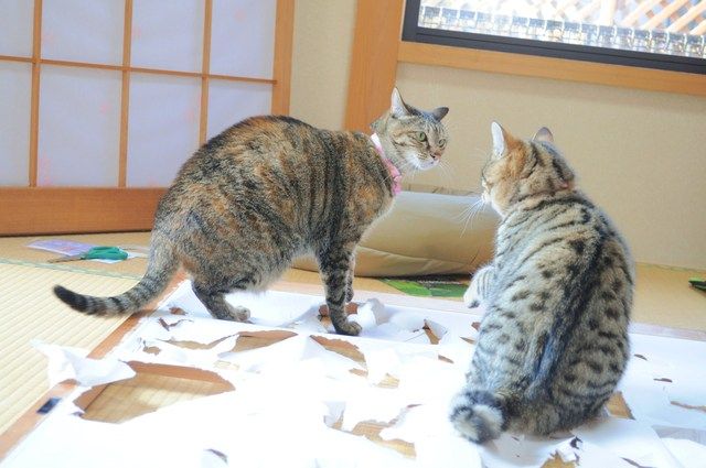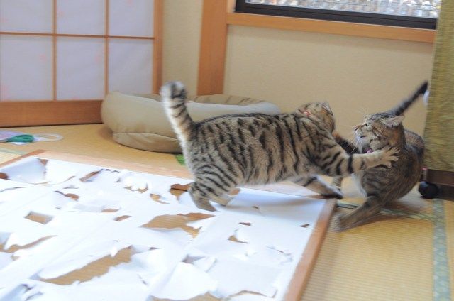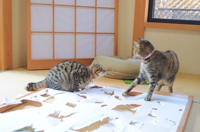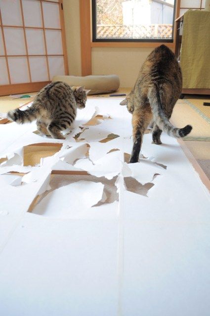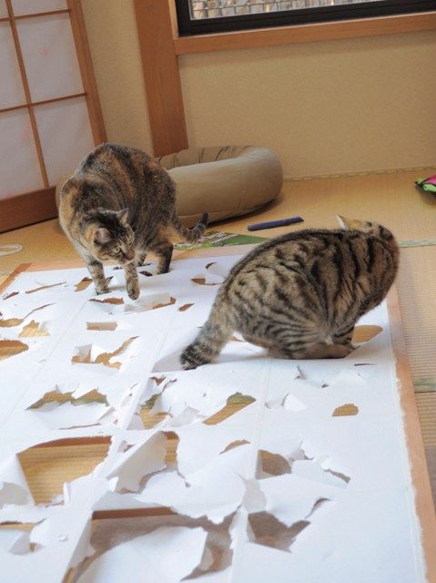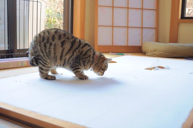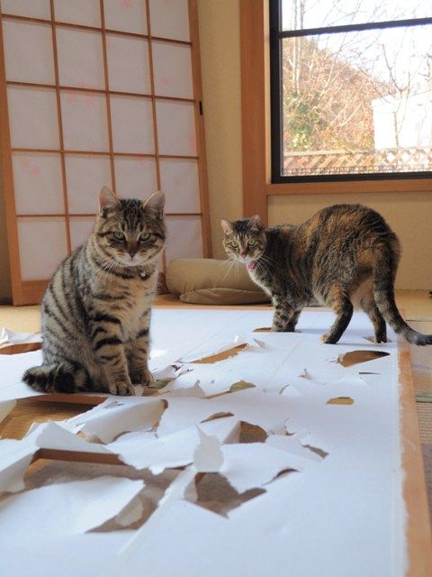 障子を貼るのは簡単でしたが、2匹を追っ払うことが大変でした。