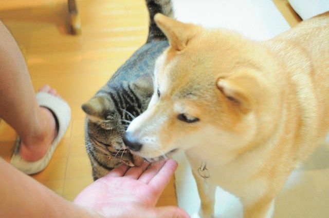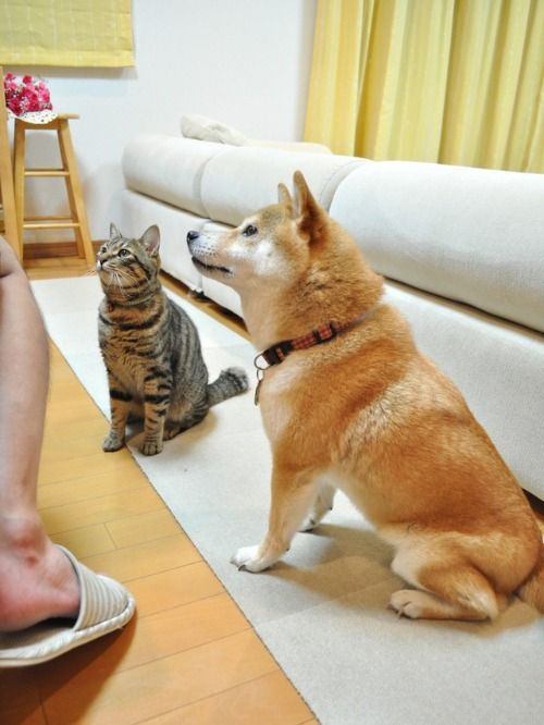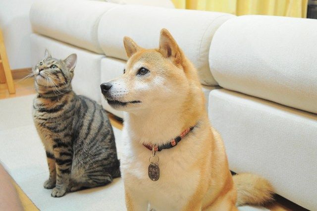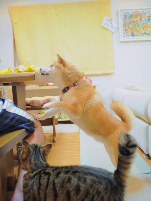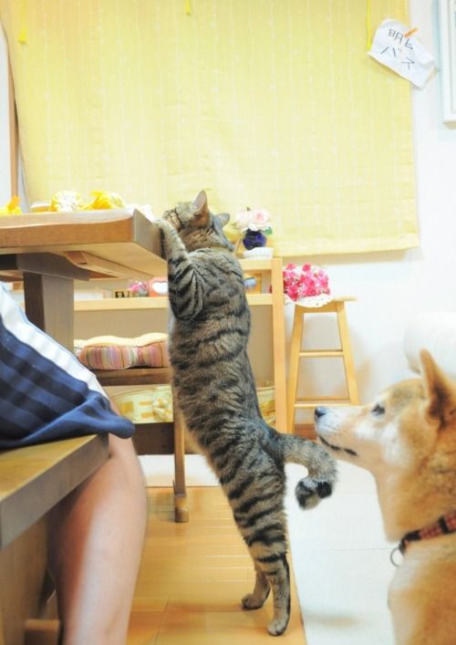 テーブルをのぞき込むぎんちゃんとかぼちゃん、うちの子と同じやん~!