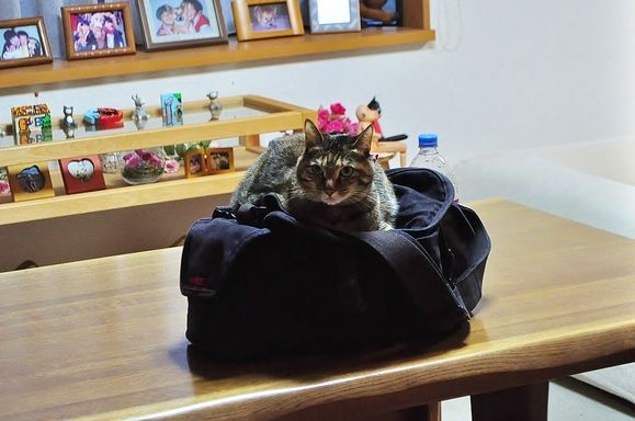 つーちゃんがキャメロンさんのカバンの上でくつろいでいました(-.-;)