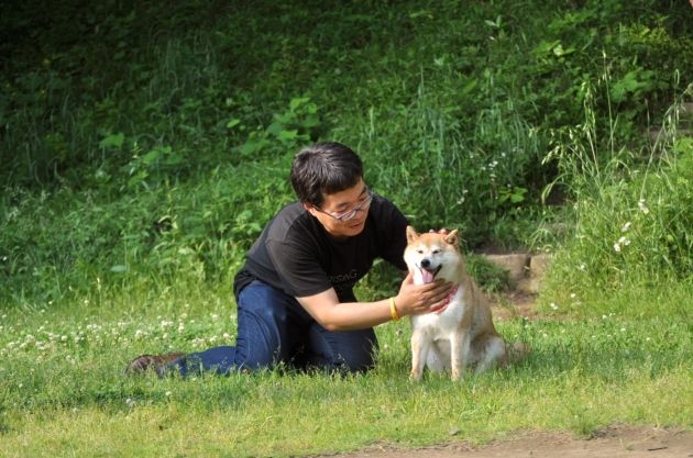 Kabosu was gazing at Mir. Hida while he was seeking in the bag.