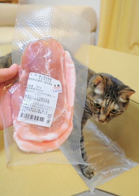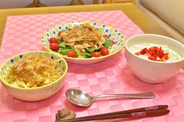 白菜サラダに掛かった鰹節を狙って
